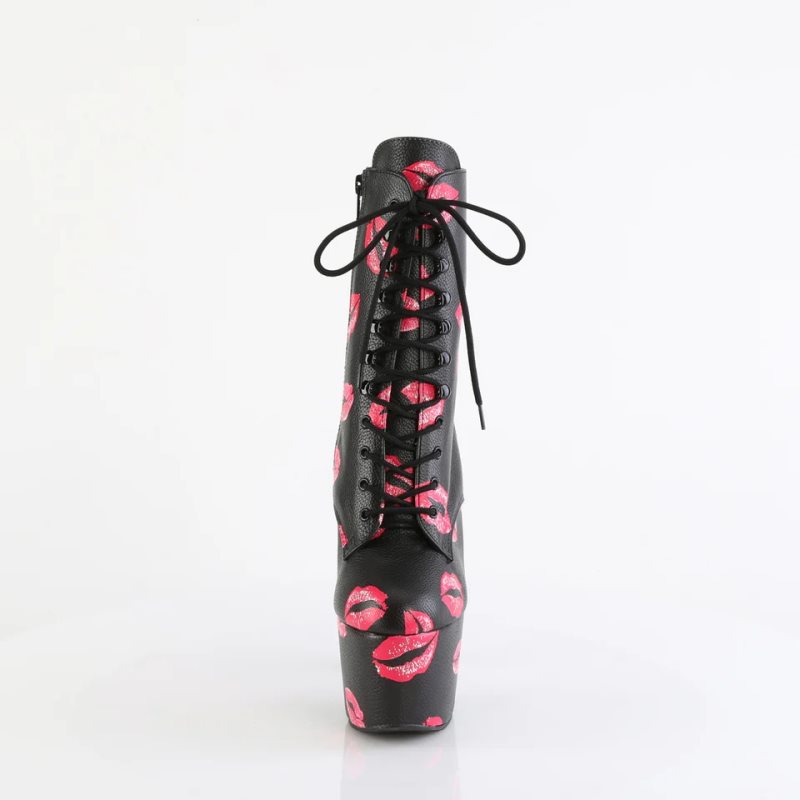 The Adore-1020KISSES boots combine fashion and flair, highlighted by their distinctive red lips print across a sleek black vegan leather upper. Standing on a 7-inch heel with a 2 3/4-inch platform, these boots accentuate your silhouette. Lace-up fronts meet practicality with a side zip closure, offering a distinct blend of style and accessibility. Perfect for making a statement wherever you go.