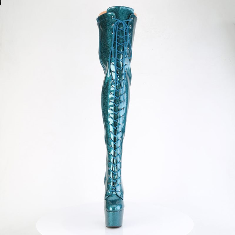 Transform your wardrobe with the Adore-3020GP thigh-high boots, where glamour meets bold style. These boots captivate with their teal glitter patent finish, paired with an audacious 7-inch heel and a supportive 2 3/4-inch platform. The lace-up front adds a dramatic flair, complemented by the convenience of a full-length inner zip closure. These boots are a dazzling choice for anyone looking to make a memorable entrance.