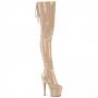 Discover the daring allure of the Adore-3850 thigh-high boots. These boots feature an impressive 7-inch heel coupled with a 2 3/4-inch platform that elevates your style literally and figuratively. The stretch lace-up back design adds visual appeal, complemented by an easy-access side zipper that runs the full length of the boot. Finished in shiny black patent, these boots are a bold choice for any adventurous wardrobe.