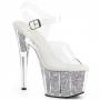 Step into the spotlight with the Adore-708G Ankle Strap Sandal. Featuring a stunning 7-inch heel and a 2 3/4-inch platform, these sandals are designed to capture attention. The glitter inserts in the platform bottom add a touch of sparkle, while the clear and black design creates a striking visual contrast. Perfect for those special nights out or performances, the Adore-708G combines height with glamour, making every step feel like a moment to shine.