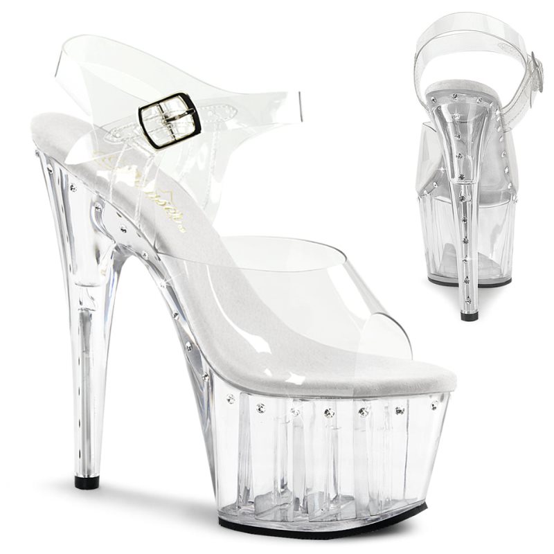Step into the spotlight with the dazzling Adore-708LS. These ankle strap sandals feature a captivating 7-inch stiletto heel and a 2 3/4-inch platform, both embellished with a single line of shimmering rhinestones that catch the light with every step. Crafted with a clear strap design, they're the perfect accessory for those who love to shine at the center of attention. Pair them with your favorite outfit and watch as they add a touch of glamour to your look.