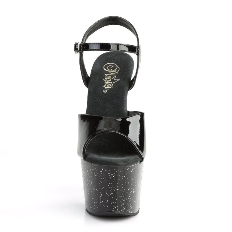Step into the spotlight with the Adore-709MG Sandals. These ankle strap sandals are your ticket to a night you'll never forget, standing tall on a 7-inch stiletto heel paired with a 2 3/4-inch platform. What sets the Adore-709MG apart is its mini iridescent glitter covering the entire platform, sparkling with every step you take. The classic black hue complements any outfit, making these sandals versatile for any event that calls for a touch of glamour.