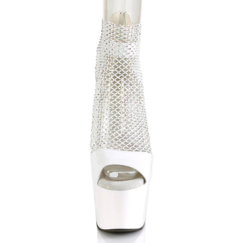 Introducing the Adore-765RM Sandal, where elegance meets boldness. These sandals showcase a dramatic 7-inch heel and a 2 3/4-inch platform, making them a true standout. The rhinestone mesh shootie design catches the light beautifully, adding a dazzling effect to any look. The elastic ankle band and the back zip closure offer practicality. Ideal for occasions where you want to shine bright. Available in classic white.