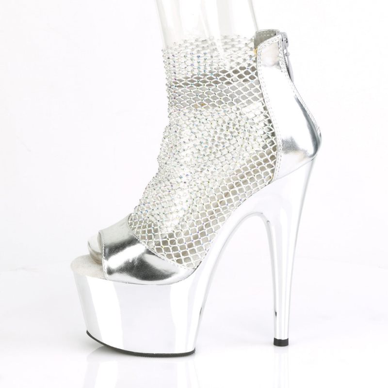 Make a striking impression with the Adore-765RM Sandal. This show-stopping piece features a 7-inch heel and a 2 3/4-inch platform, offering both height and style. The close back design is adorned with an eye-catching rhinestone mesh, adding a glittering element to your look. An elastic ankle band adds sophistication, and the back zip closure provides practicality. In shimmering silver, these sandals are ideal for special occasions or a night on the town. Let your sparkle shine with the Adore-765RM.