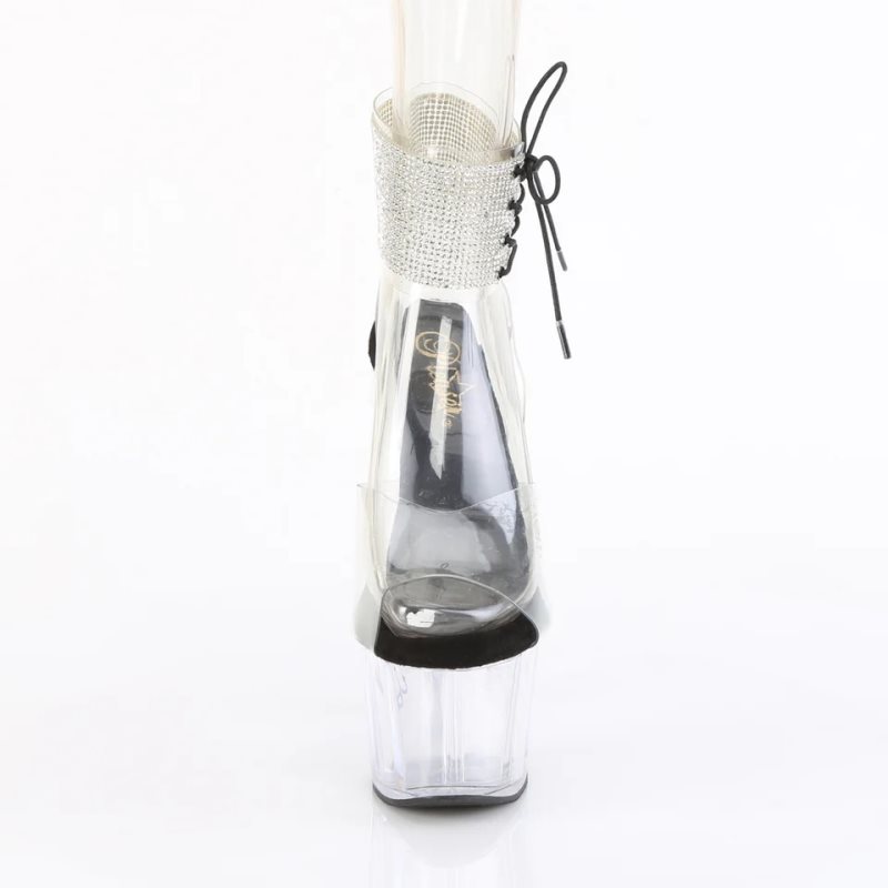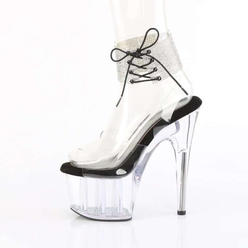 Enhance your footwear collection with the Adore-791-2RS Sandals. Featuring an impressive 7-inch heel and a 2 3/4-inch platform, these sandals are designed to elevate your fashion game. The ankle cuff is adorned with stunning rhinestones, adding a touch of luxury and glamour. The unique side lacing and the sleek black and clear color scheme make these sandals a fashionable choice for those looking to stand out. Ideal for special occasions or making a bold statement on a night out.
