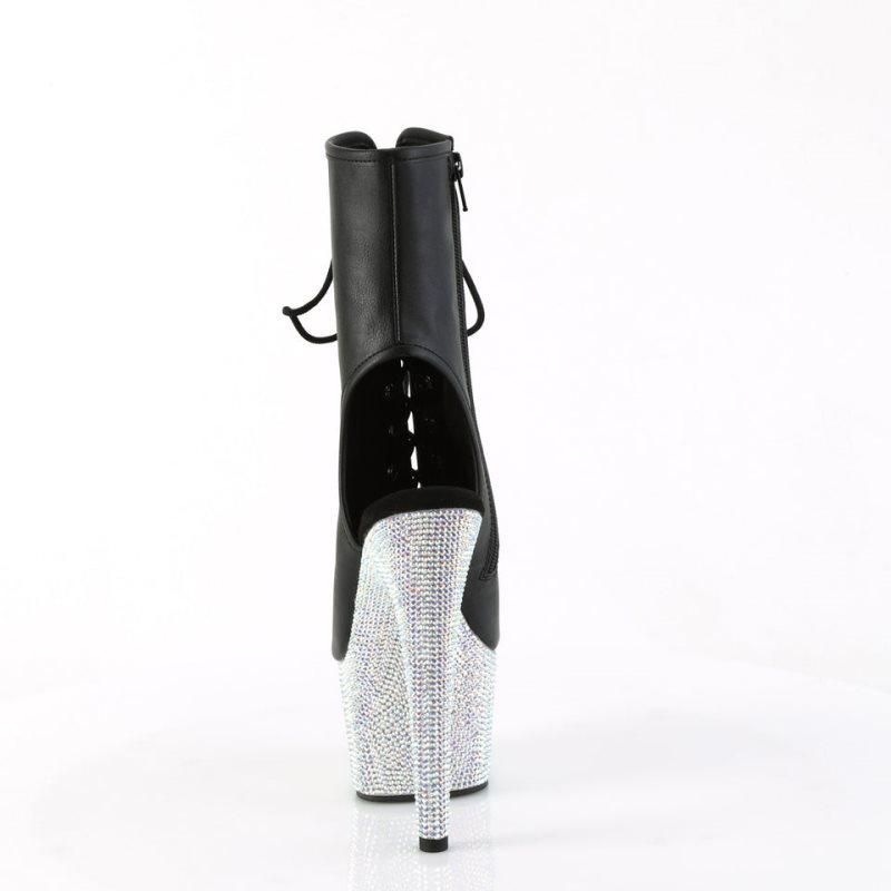 Elevate your footwear game with the Bejeweled-1016-7 Ankle Boot. These stunning boots feature a bold 7-inch heel and a 2 3/4-inch platform, adorned with brilliant silver AB rhinestones that catch the light from every angle. Crafted from black vegan leather, these boots offer an open toe and heel for a modern and chic look. The lace-up front adds a touch of elegance, complete with its inner side zip closure. Perfect for making a statement, these boots add a dazzling touch to any ensemble.