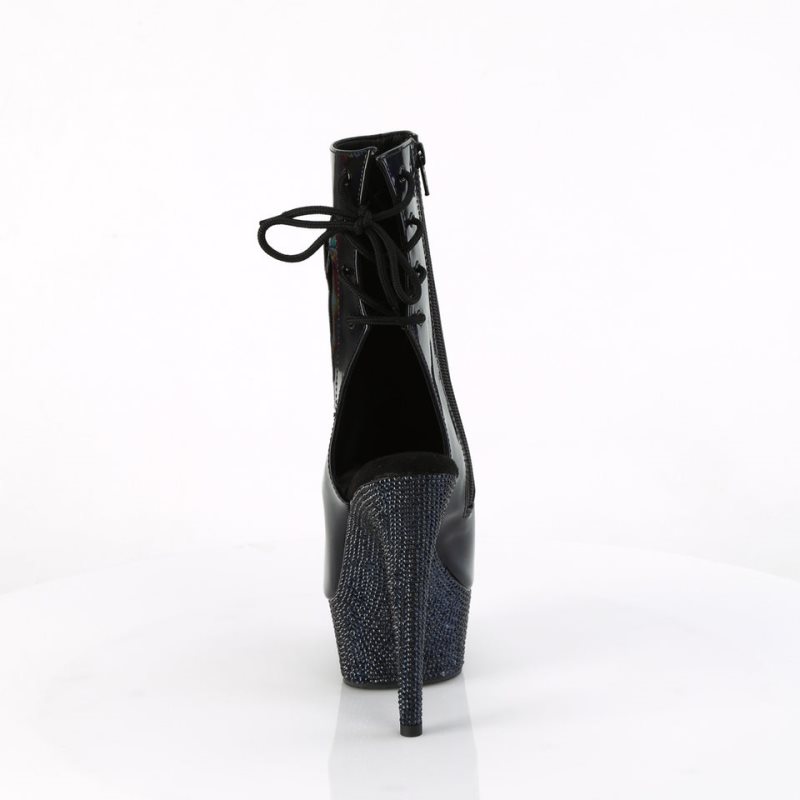 Step into a world of sparkle and glamour with the Bejeweled-1018DM-6 Ankle Boots. These mesmerizing boots feature a dazzling 6-inch heel complemented by a 1 3/4-inch platform, setting the stage for a night of enchantment. The open-toe and heel design, paired with a lace-up back, creates a captivating silhouette, while the hidden zip pocket adds a practical touch. Adorned with rhinestones across the entire platform, these boots shimmer with every step. The inner side zip closure makes slipping them on a breeze, letting the black hologram finish shine in the limelight.