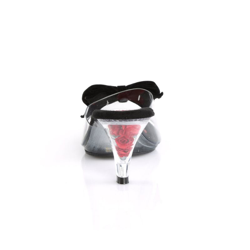 Step into classic glamour with the Belle-301BOW Slides by Pinup Couture. These charming slides feature a 3" heel and a delicate 1/8" platform for just the right amount of lift. Adorned with a luxurious velvet bow, the black upper exudes timeless elegance, while the clear heel filled with petite flowers adds an enchanting touch. Perfect for a night out or a sophisticated event, these slides effortlessly blend vintage appeal with modern style.