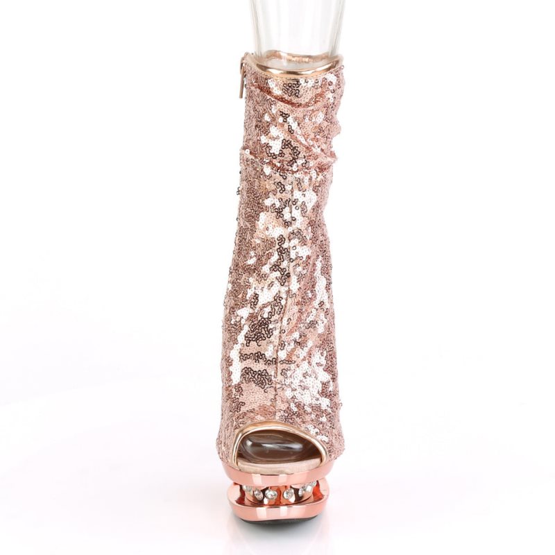 Elevate your ensemble with the Blondie-R-1008 ankle boots, where opulence meets flair. Featuring a bold 6-inch heel and a 1 1/2-inch platform, these boots showcase a captivating two-tone ruched sequined design. Rhinestone accents in the mid-platform add an extra layer of sparkle, making them ideal for special occasions. The open-toe design complements the rose gold finish. Make a glamorous entrance with the Blondie-R-1008.