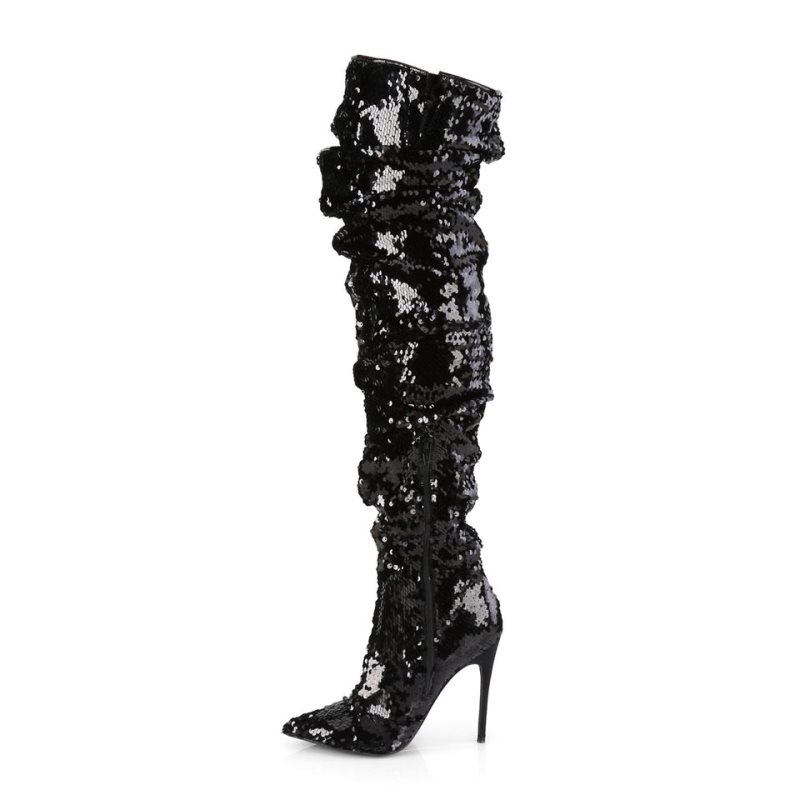 Step into unparalleled glamour with the Courtly-3011 over-the-knee boots. Featuring a stunning 5-inch heel, these boots capture attention with their ruched, slouchy sequins body that shimmers with every step. The chic black design adds a versatile touch, making them perfect for any high-energy event. The 1/3 inside zip closure provides easy wearability, so you can take the spotlight effortlessly. Elevate your ensemble with these captivating boots and let your style shine.