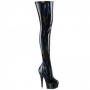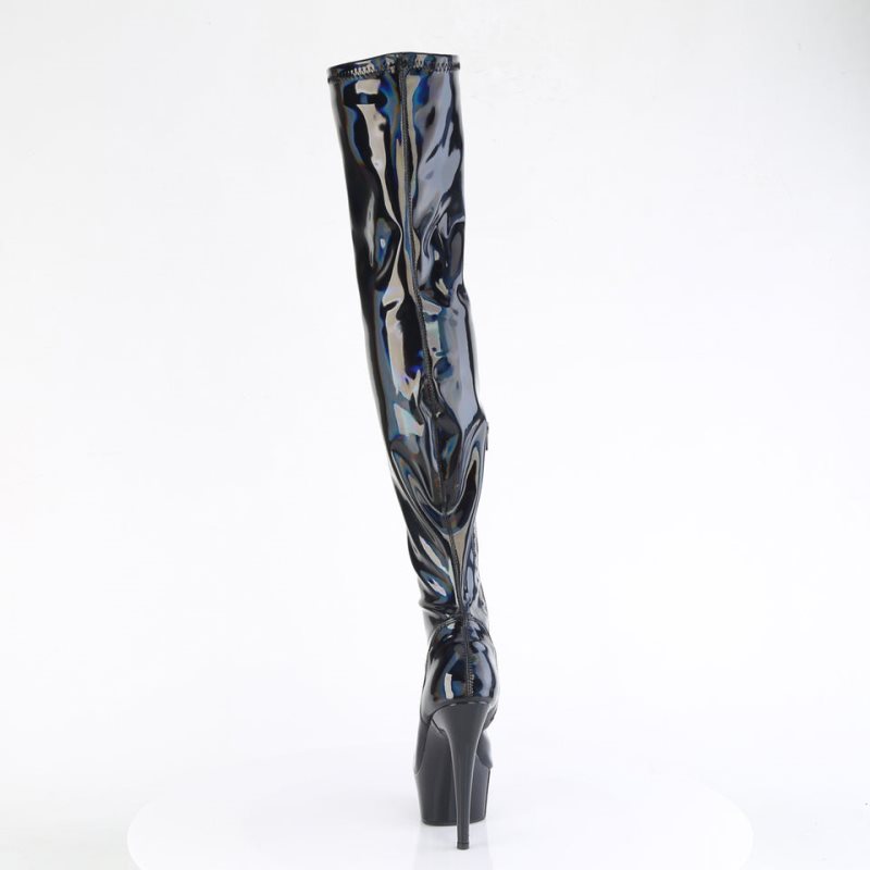 Unleash your inner diva with the Delight-3000HWR thigh-high boots. Standing tall with a 6-inch stiletto heel and a 1 3/4-inch platform, these boots are made to captivate. The striking black hologram material stretches for a dramatic, reflective effect, while the fully wrapped matching platform completes the look. A 12-inch inner side zipper makes these boots both functional and fabulous. Step into the spotlight with the Delight-3000HWR and let your confidence shine.