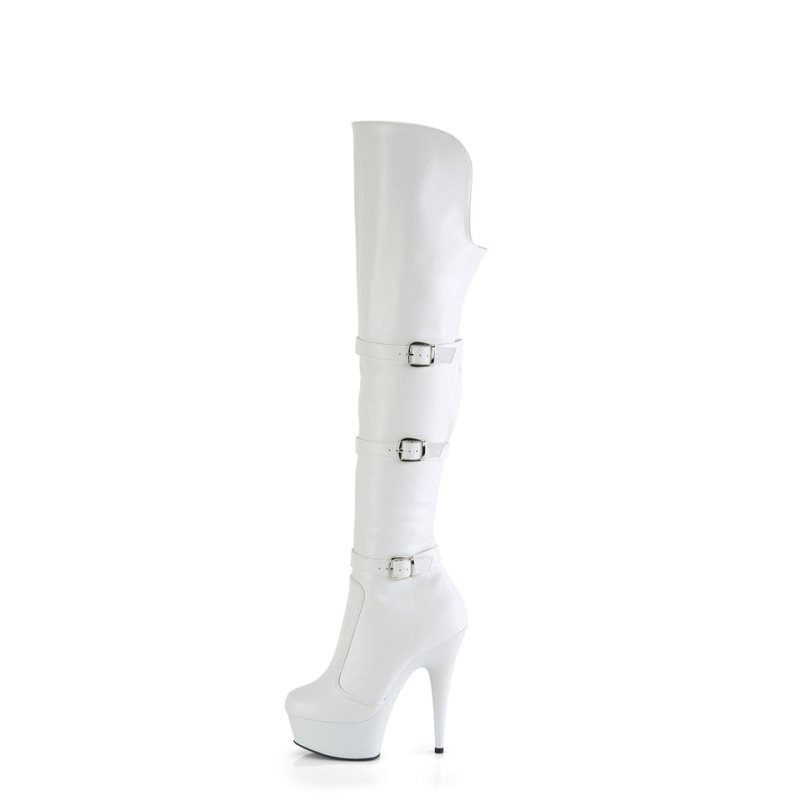 Step into the spotlight with the Delight-3018, an over-the-knee boot that stands out with its triple-buckle design and sleek white vegan leather. This boot features a 6-inch heel paired with a 1 3/4-inch platform, offering a bold boost to your height. The 2/3 inner side zipper allows for easier access. Ideal for those who love to make a statement with their footwear, the Delight-3018 brings style and attitude to any ensemble.