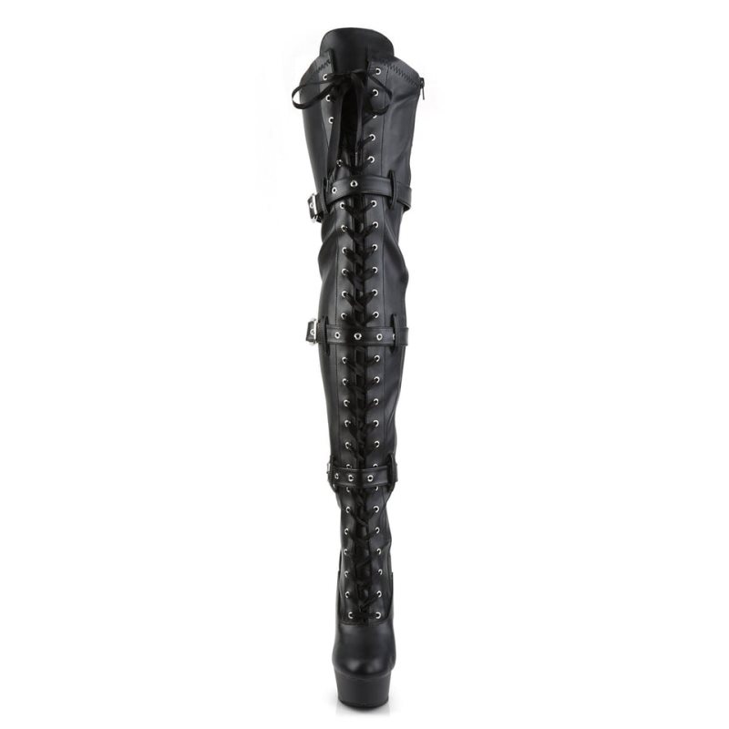 Step into daring elegance with the Delight-3028 Thigh High Boot. Featuring a striking 6-inch stiletto heel and a 1 3/4-inch platform, these boots are designed to captivate attention. The ribbon lace-up and triple buckle strap details lend a touch of sophistication, while the stretchy thigh-high construction enhances your silhouette. Slip into these boots effortlessly with the full inside zip closure. For those who embrace bold fashion choices, the Delight-3028 is a must-have addition to your wardrobe.