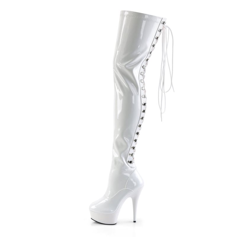 Discover the Delight-3063, a thigh-high boot that combines bold design with feminine charm. Towering with a 6-inch heel and balanced on a 1 3/4-inch platform, these boots are crafted to make you feel invincible. The back is adorned with a distinctive D-ring lace-up, offering a personalized fit, while the stretch material ensures comfort with each step. A full-length inner side zip closure provides ease of wear. Finished in a stunning white, these boots are for those looking to make a statement with their footwear choices.