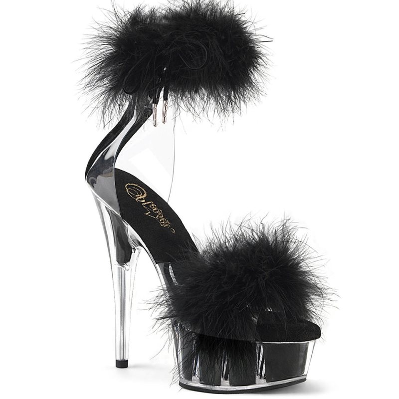 Transform your style with the Delight-624F Sandals. These striking ankle cuff sandals boast a 6-inch heel and a 1 3/4-inch platform, accentuated by side lacing and plush marabou fur detailing. The unique clear and black color scheme makes these sandals a standout addition to any wardrobe, offering a blend of glamour and sophistication. Perfect for a night out or special event, these sandals truly capture attention.