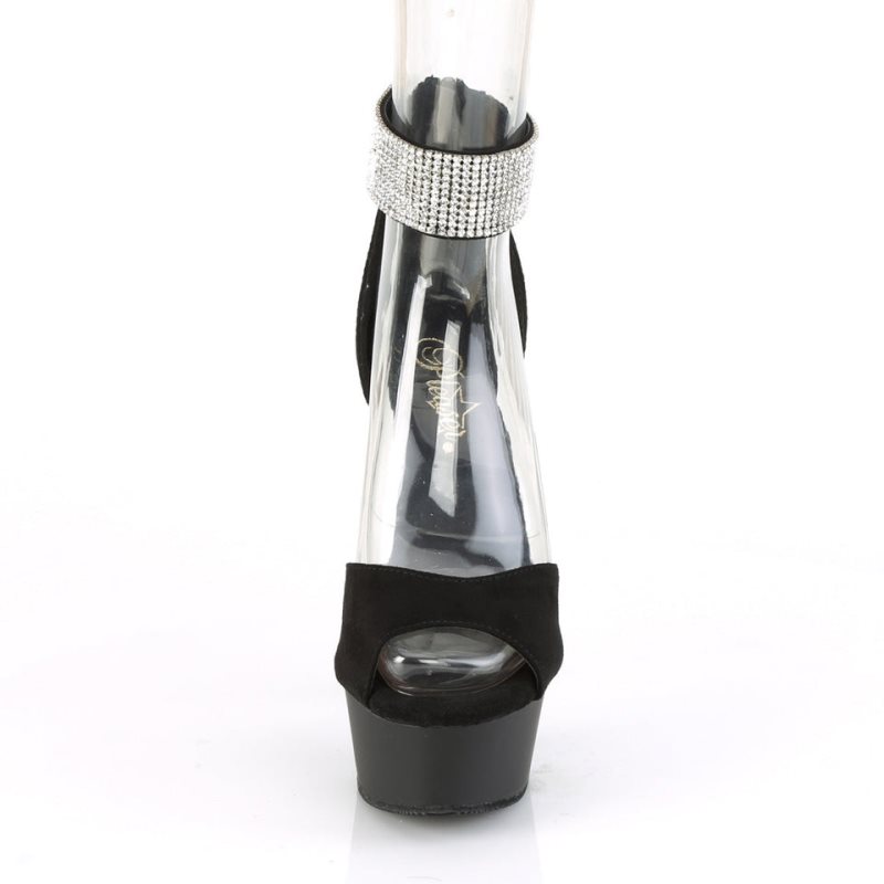 Step into a world of glamour with the Delight-625 sandals. These stunning 6-inch heels feature a 1 3/4-inch platform, providing just the right lift while showcasing your confidence. The open toe design is balanced by a closed back, offering a striking contrast. Adorned with a rhinestone-embellished ankle cuff, these black suede sandals add a touch of sparkle to any ensemble. The back zip closure allows for easy wear, making the Delight-625 a dazzling addition to your footwear collection.