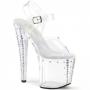 Step into the spotlight with the Enchant-708RS-02 sandals, where fashion meets a flare of dazzle. These stunning sandals feature an 8-inch heel paired with a 3 3/4-inch platform, both highlighted by a prismatic linear design that captivates and catches the light. Adorned with AB rhinestone cone studs on the front and outer side of the platform, these sandals add a spectacular sparkle to any outfit. Ideal for those who love to stand out.
