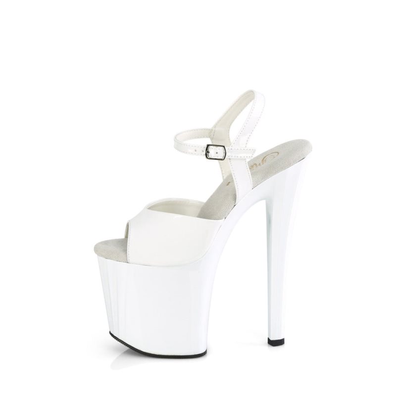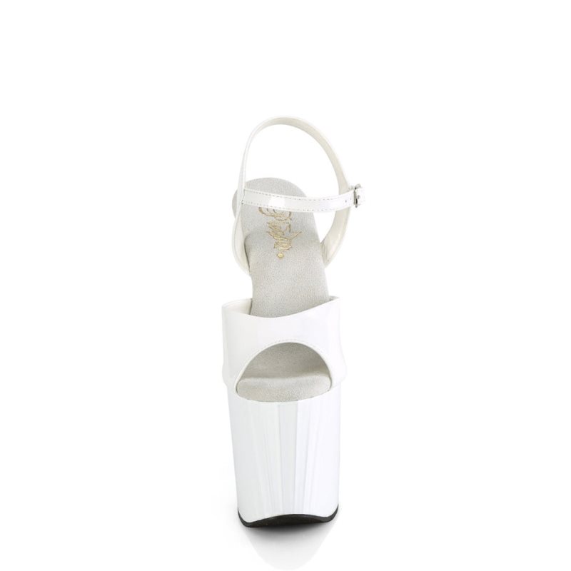 Unveil your inner diva with the Enchant-709 Sandals. These ankle strap sandals feature an impressive 8" heel and a 3 3/4" platform, making them a powerful addition to any wardrobe. What sets them apart is the prismatic linear design adorning the platform front and back of the heel, adding a radiant touch to the elegant white finish. Perfect for making a bold fashion statement, these sandals are ideal for those who love to shine. Embrace the enchanting allure and elevate your ensemble with these captivating heels.