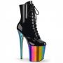 Step into a world of vibrant style with the Flamingo-1020RC ankle boots. Featuring a breathtaking 8-inch heel and a striking 4-inch platform, these boots will elevate your look effortlessly. The rainbow chrome plated platform bottom adds a touch of dazzling color, while the lace-up front and inside zip closure offer a versatile fit. The sleek black and multicolor design make these boots a must-have for those who love to make a bold statement.