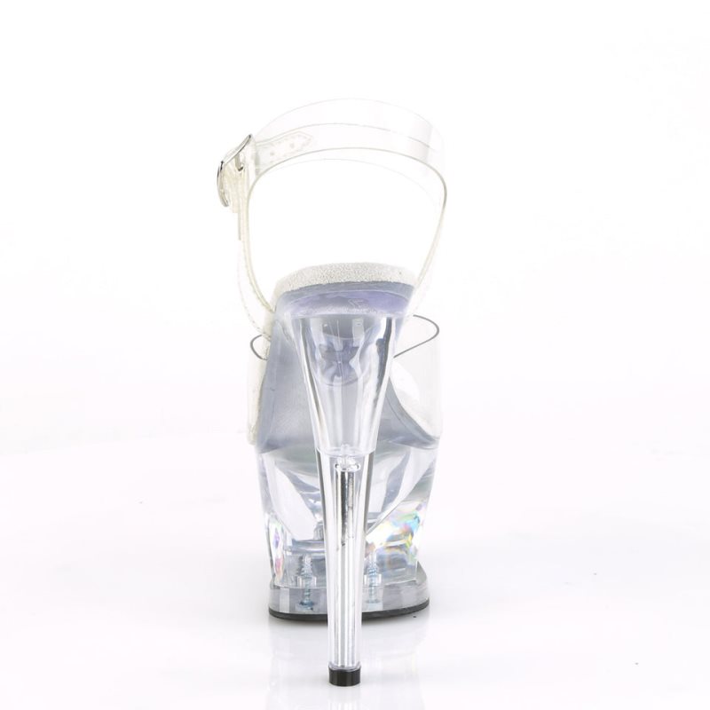 Step into elegance with the Moon-708DIA Ankle Strap Sandal. Featuring a stunning 7-inch heel and a 2 3/4-inch cut-out platform, this sandal is designed to turn heads. The show-stopping faceted cut crystal glass diamond inside the platform adds a touch of glamour, catching the light with every step. With a sleek ankle strap for added style, the clear design complements any outfit. Elevate your footwear collection with these dazzling sandals that are perfect for making a statement.