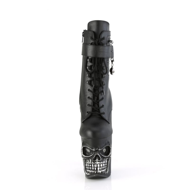 Dare to be different with the Rapture-1020STR-LT ankle boots, where dark fantasy meets cutting-edge technology. These striking boots feature an 8" finger bone heel and a 4" skull-sculpted platform, making them a standout in any collection. Crafted from black vegan leather, they exude an air of mystery and sophistication. What truly sets them apart is the USB chargeable red LED lights in the eyes of the skull and the back, which offer multiple static and changing patterns. Turn heads and light up the night with every step.