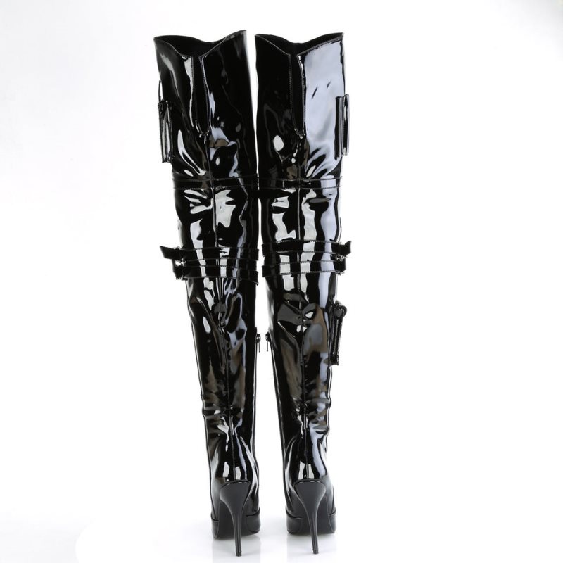 Step into the spotlight with the Seduce-3019, a pair of striking thigh-high boots that combine style and function. Boasting a 5-inch heel and double buckle straps, these boots feature an eye-catching asymmetric outer side design on each foot. A snap button pocket and swivel snap hook add unique character to the look. The back slit accentuates your legs, while the 1/3 inner side zip closure completes the design. The timeless black color makes these boots a chic addition to any ensemble.