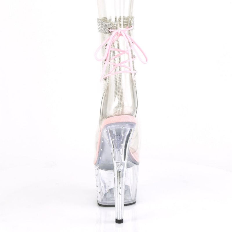 Make a bold statement in the Stardust-1018C-2RS ankle boot, a must-have for adding a touch of sparkle to your outfit. Sitting atop a 7-inch heel and a 2 3/4-inch platform, these boots feature an open toe and heel for added flair. The lace-up back and rhinestone embellishments along the center front and ankle opening provide intricate detailing, while the rhinestone-studded heel and outer side shine brilliantly. The baby pink/clear color elevates its glamorous appeal.