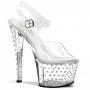 Step into the spotlight with the Stardust-708 sandals. These stunning ankle strap platform sandals feature a dazzling 7-inch heel and a 2 3/4-inch platform, both adorned with rhinestone studs that catch the light with every movement. The chrome finish adds a sleek, modern twist, while the clear straps complement any outfit. Ideal for those who love to shine at any party or event.